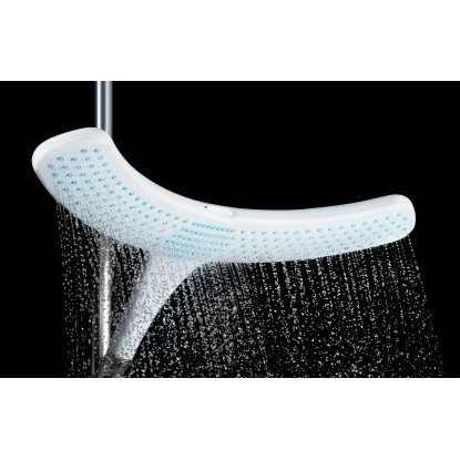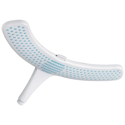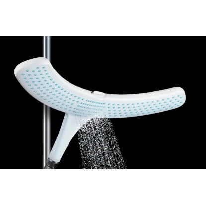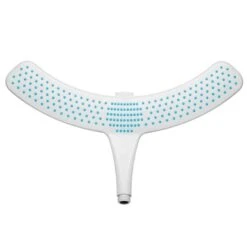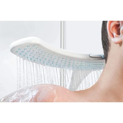 Komfortabel duschen, ohne dass dabei Ihre Haare nass werden? Mit dem Duschkopf Doosh von Stefan Raab kein Problem mehr. Auf Schulterhöhe eingestellt ermöglicht Ihnen der breite Wasservorhang aus 204 Strahldüsen ein angenehmes Wellness-Duschen – und die Haare bleiben trocken. Durch den angenehmen Wasservorhang spritzt das Wasser nicht hoch und Ihre Schultern werden gleichmäßig nass und warm. So können Sie zum Beispiel auch ganz entspannt Ihre Haarkur einwirken lassen. Zum Haarewaschen stellen Sie ganz einfach per Knopfdruck auf den zentralen Powerstrahl um. Doosh ist sparsam im Wasserverbrauch und wird aus kontrollierten Materialien in Deutschland hergestellt. Der Design-Duschkopf passt auf jeden handelsüblichen Anschluss. Der Austausch dauert weniger als 1 Minute.