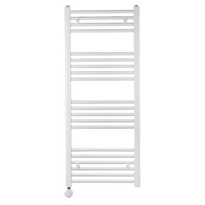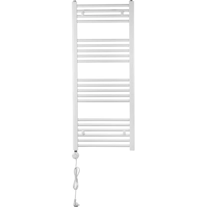 Der Handtuchheizkörper ist klassisch in Weiß gehalten. Sein zeitlos elegantes Design passt zu jedem Einrichtungsstil. Er verfügt über 20 Querstreben, an denen Sie mehrere Handtücher platzieren und vorwärmen bzw. trocknen können. Dank seiner flachen Bauweise und den Maßen von 120 cm x 50 cm (H x B) kann der Badheizkörper auch in engen oder kleinen Räumen angebracht werden. Er verfügt über einen Heizstab mit einer Leistung von 600 W für eine gleichmäßige Wärmeverteilung und ist insbesondere für die Nutzung in Feuchträumen geeignet.